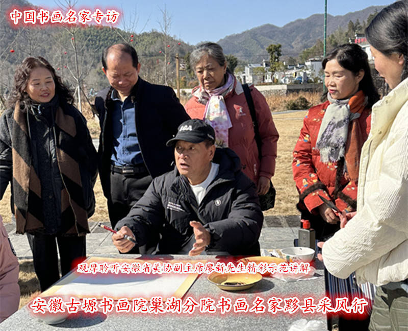 正当众人沉浸在创作的喜悦中时,安徽省美协廖新副主席的到来,为这场采风增添了更多的惊喜与收获。平时谈笑风生,口若悬河的廖副主席没有过多的寒暄,径直走到众人身边,细细端详着每一幅作品。他时而驻足凝视,时而轻声询问创作思路,随后便拿起画笔,现场进行实战演练。